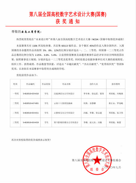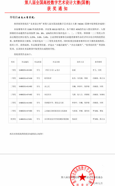 本届赛事共有1106所高校参赛,共征集60113幅作品。各个赛区45%的作品入围全国终评,入围国赛的非命题类作品再按照5%、8%、12%的比例分别评选出一、二、三等奖,即国赛一二三等奖占作品总数的比例分别为2.25%、3.6%、5.4%。在此次比赛中,云南工商学院艺术与设计学院的视觉传达设计专业、数字媒体艺术设计专业、视觉传播设计与技术专业的师生共摘得西南赛区一等奖11项、二等奖14项、三等奖20项;国赛一等奖2项、二等奖4项、三等奖4项,优秀奖1项。
