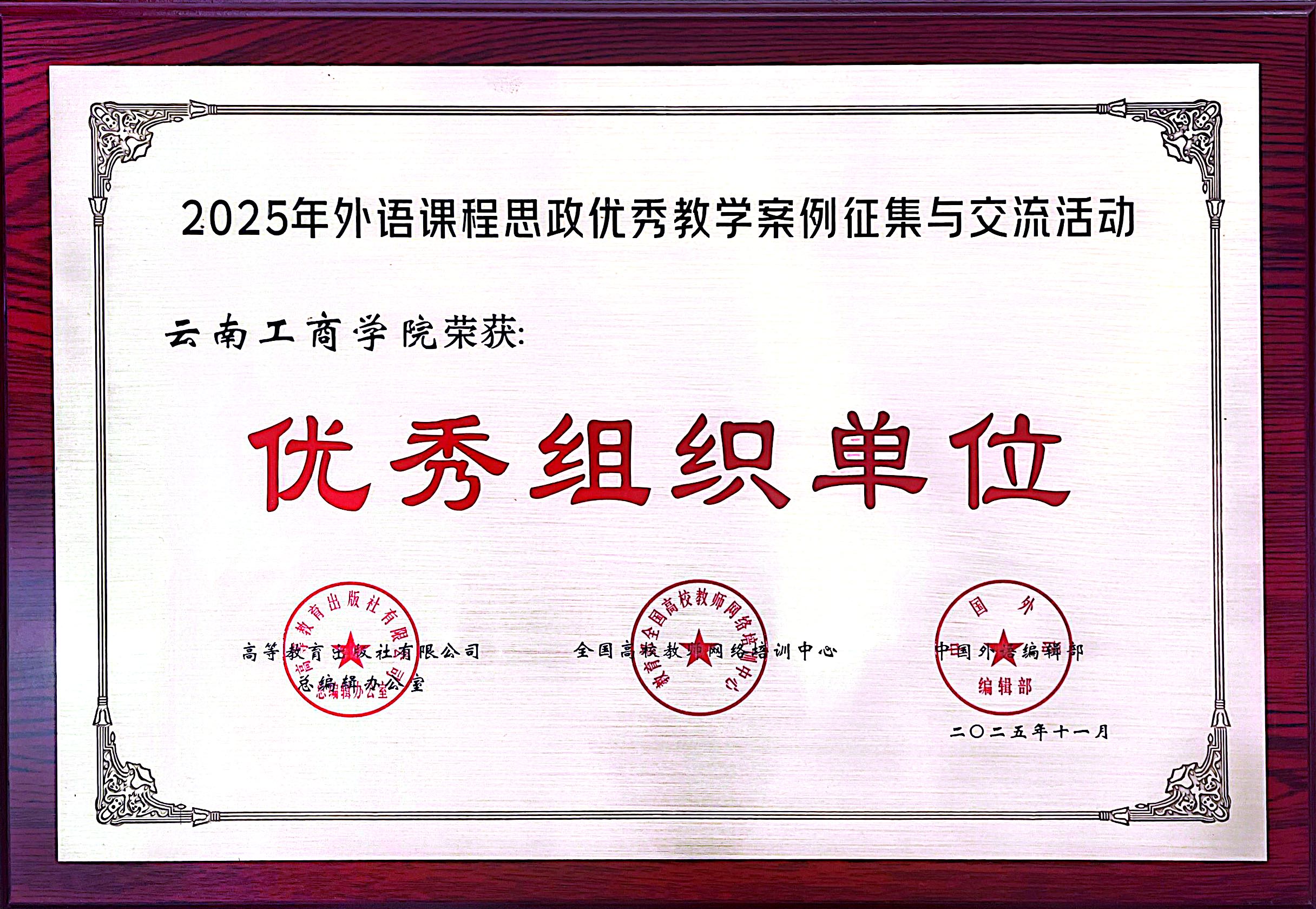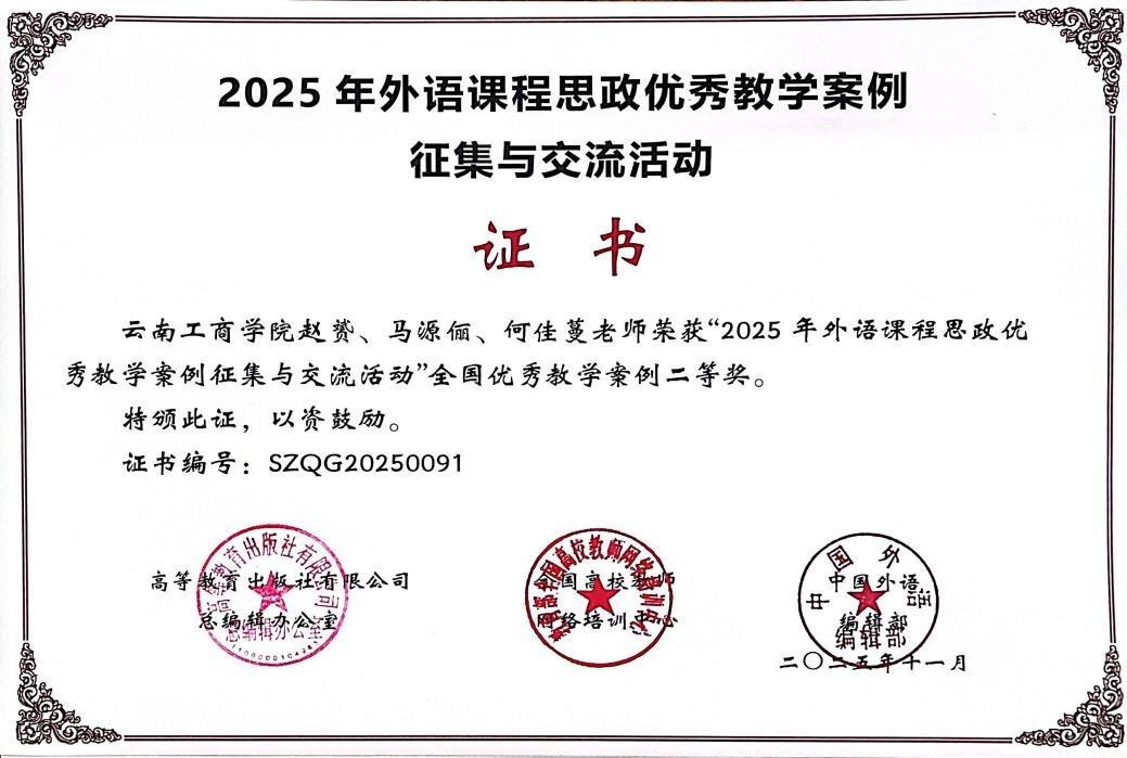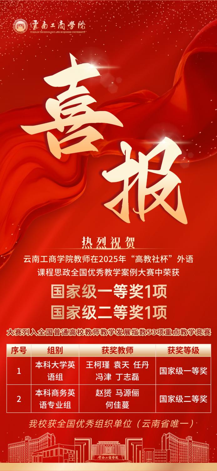 “高教社杯” 外语课程思政优秀教学案例征集与交流活动是经中国高等教育学会认定的“高校教师重点教学竞赛”,已纳入“全国普通高校教师教学发展指数”,是全国外语教育领域极具影响力的重要赛事。本次大赛吸引了清华大学、国防科技大学、西安交通大学等567所知名院校的 3620名教师同台竞技,共收到参赛作品1037件。经过学校推荐、组委会严格审核及专家委员会权威评审等多轮筛选,仅104件作品脱颖而出进入国赛现场交流,竞争尤为激烈。在此背景下,云南工商学院参赛团队逆势突围、斩获佳绩,既是对教师专业素养与教学能力的高度认可,更是学校深耕课程思政、推进教育教学改革的显著成果。